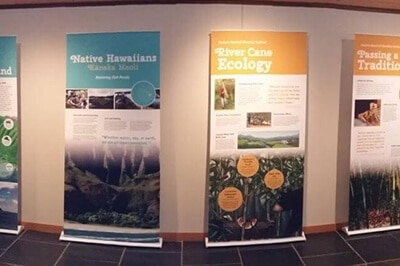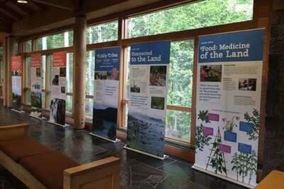Based on the larger exhibition, the banner version of Roots of Wisdom: Native Knowledge. Shared Science. was created in collaboration with the Smithsonian Institution National Museum of the American Indian (NMAI) and the Smithsonian Institution Traveling Exhibition Services (SITES). Lightweight graphic panels present adapted content in a format that is accessible for small tribal museums and other small venues with limited resources and exhibition space.